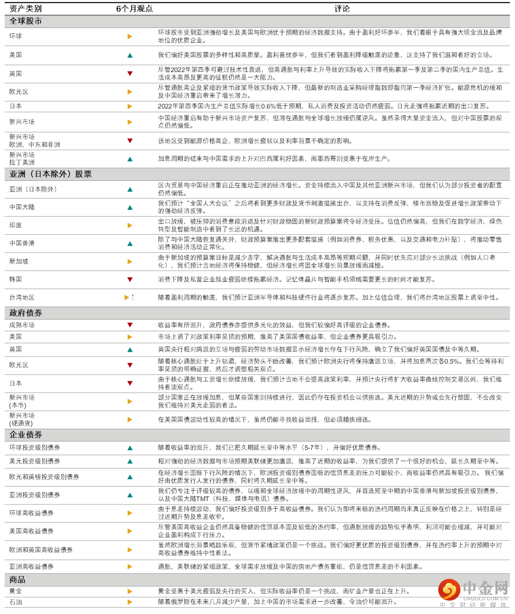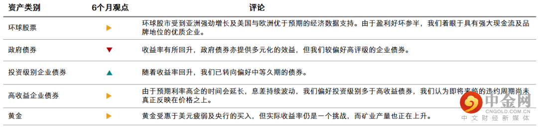 图标:↑ 对此资产类别的观点已上调;↓ 对此资产类别的观点已下调。