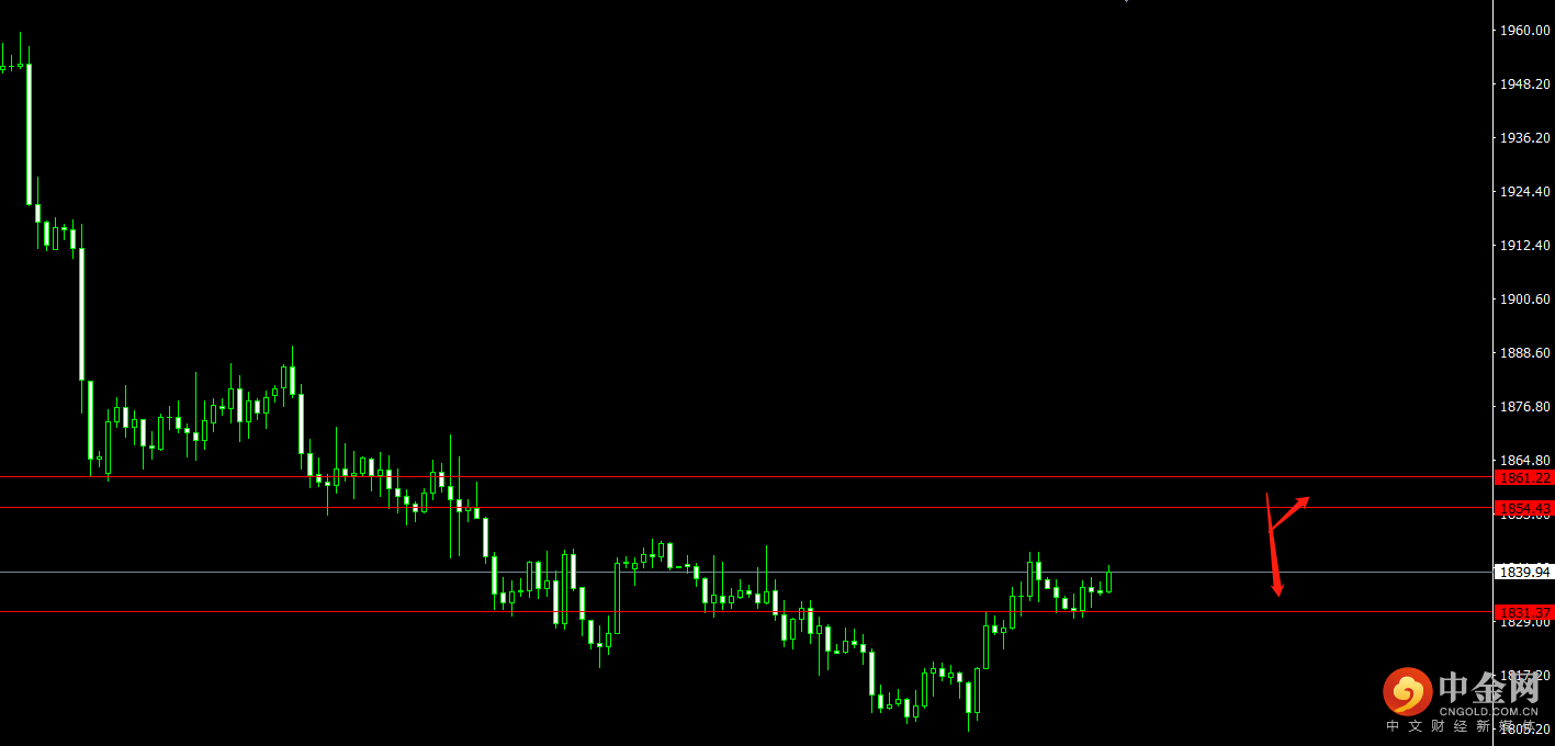 美元指数承压,黄金受支撑,关注1831.40的支撑位,4小时回调收多即可看多至压力位1861.20位置;关注1854.40压力位,4小时受阻收空即可看空至1822.40。