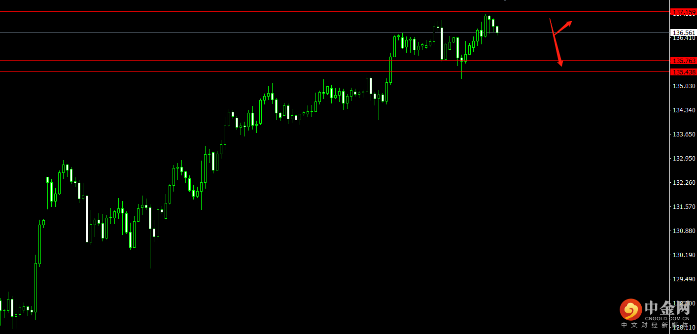 美元指数承压,日元下跌,关注135.760的4小时支撑位置,回调收多可看多至137.460;关注137.160压力位,4小时受阻收空即可看空至135.440。