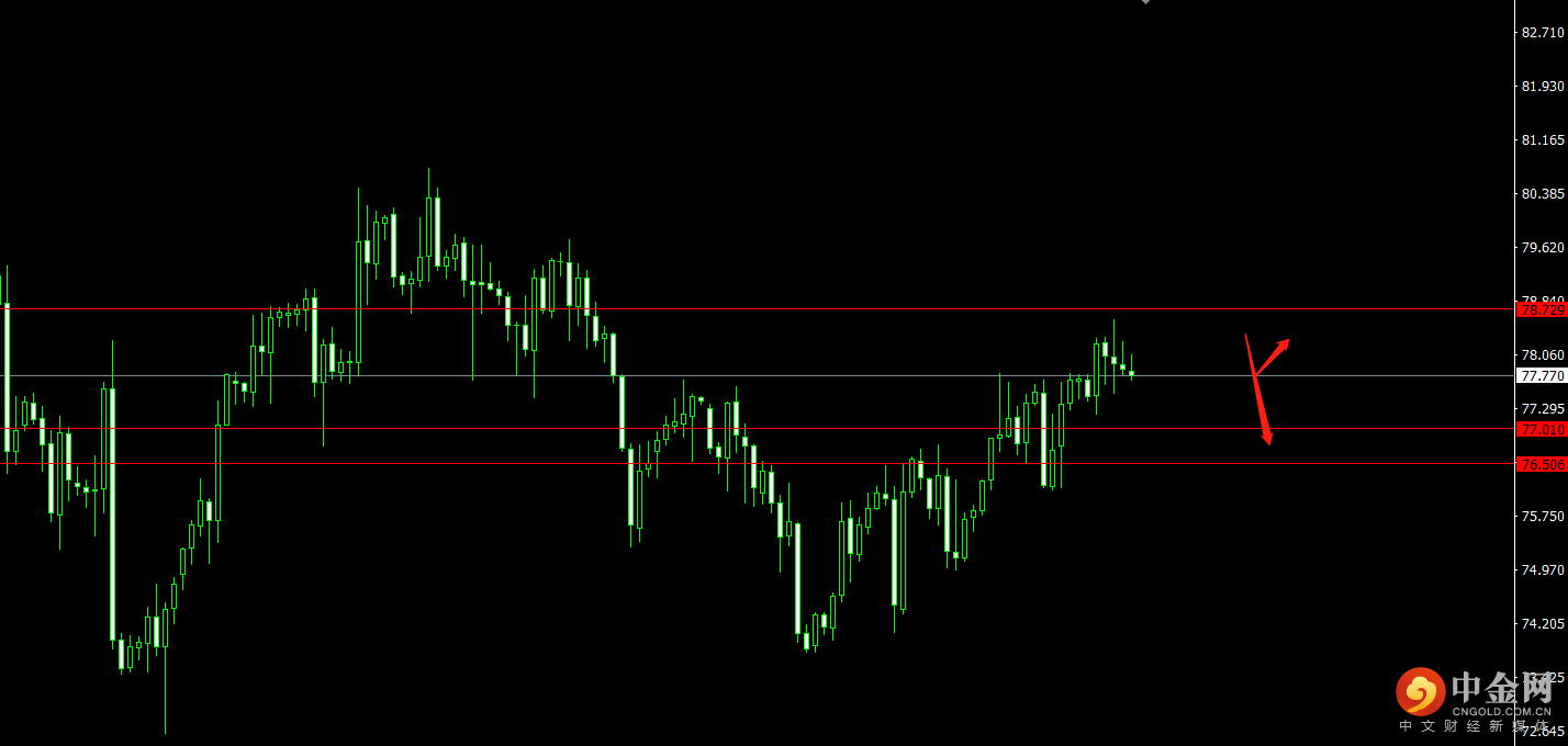 美元指数承压,原油下跌,关注77.010的4小时支撑位置,回调收多可看多至79.060;关注78.730压力位,4小时受阻收空即可看空至76.510。