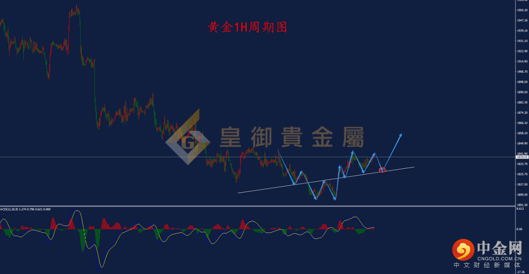 从下图的黄金1H周期图来看,昨日黄金维持弱势震荡,从结构来看,当前走势行情依旧属于反弹中,价格二次上冲并未突破前期高点,表明动能相对较弱,从形态上看,前期行情在下跌后,二次探底形成明显的W底部形态,日内可关注W形态颈线支撑,短线看涨概率较大。结合MACD指标来看,双线处于零轴附近,但双线金叉往上,表明反弹持续中,预示价格短线还有冲高可能,日内可以等待价格回落1822支撑附近,考虑尝试轻仓做多。