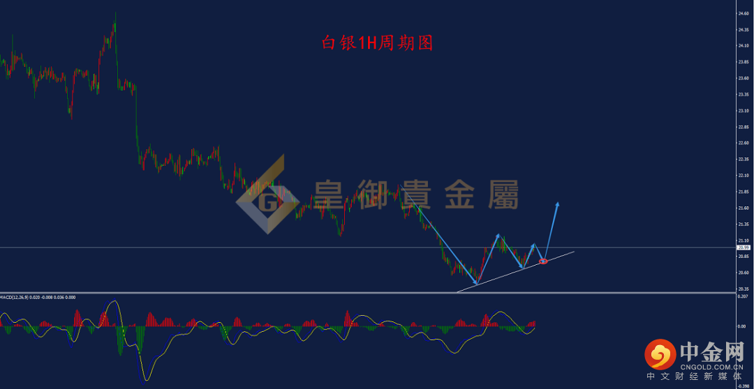 从下图白银1H周期图来看,白银经过连续单边下跌后,价格出现触底反弹,从结构来看,反弹动能出现减弱,昨日未能突破前期高点,但低点出现逐渐抬高迹象,表明行情处于震荡中,日内可关注上升支撑线的支撑效果,此为不破短线可继续看涨。结合MACD指标来看,双线在零轴附近区域,表明多空势均力敌,但双线有金叉迹象,预示价格短线有上涨概率,日内可以等待价格回落20.80支撑附近,考虑尝试轻仓做多。