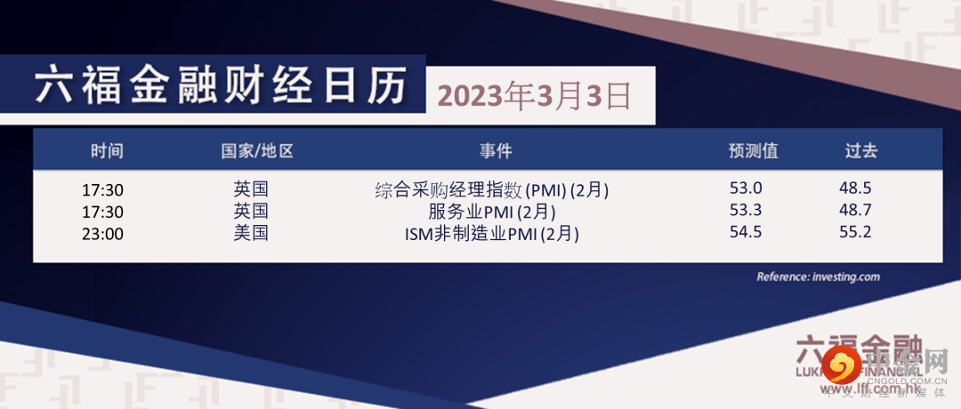 【六福金融财经日历 - 3月3日】投资者请留意!今日将公布以下经济数据:- 英国综合采购经理指数 (PMI) (2月) - 英国服务业PMI (2月)- 美国ISM非制造业PMI (2月)