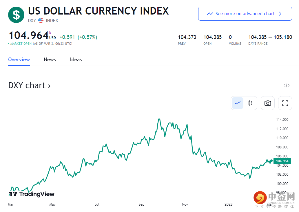 美元指数震荡上行,日线小幅收涨 0.57% 至 104.95,反弹至七周高位。