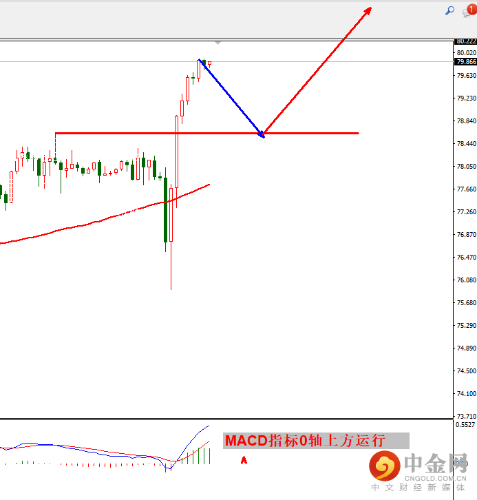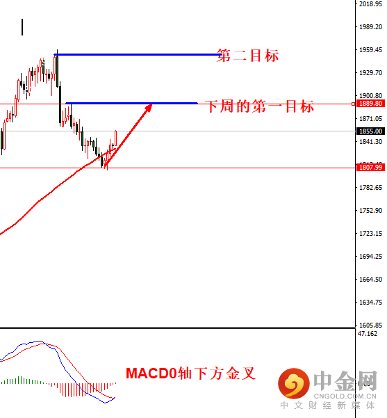 黄金日线连阳上升,单阴下跌,周五大阳上升,已经很明显的多头走势,MACD指标0轴下方金叉,形态和指标