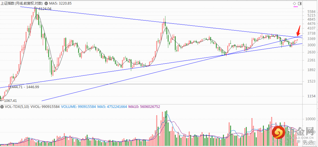 上图是上证指数月K线图,上证指数月线持续震荡收阳上行,指数目前依然是缓慢上行趋势,未来指数还能继续上涨,关注月楔形上轨的压力。