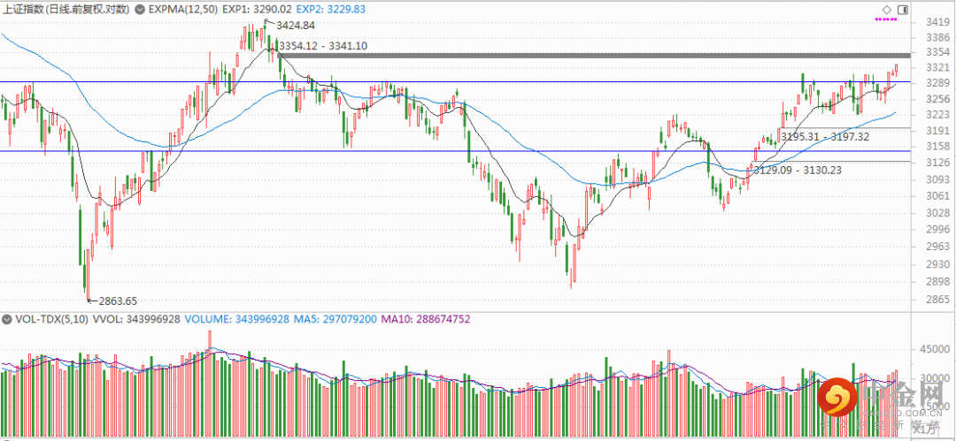 上图是上证指数日K线图,上证指数日K线目前已经站上最重要的压力线(其实是日箱体上轨),而且量能明显开始放大。未来只要量能不萎缩,指数将开始逐渐补缺并挑战前期3424的高点压力。