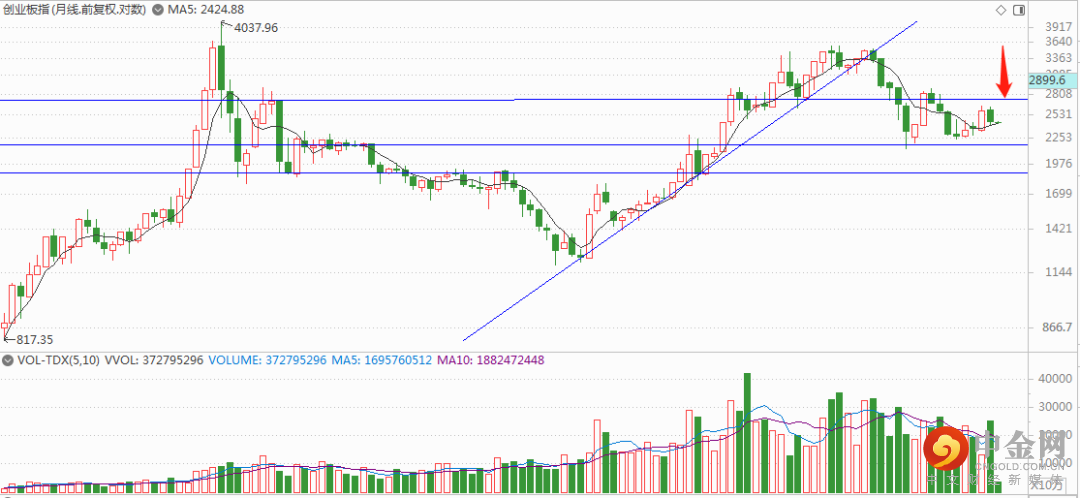 然后,我们看看创业板指数月K线走势。