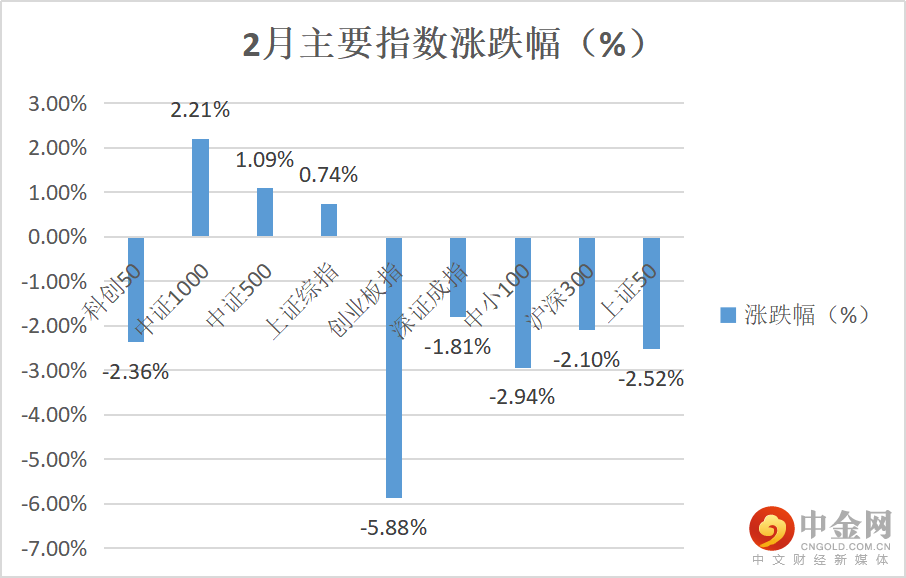2月份,主要宽基指数在1月大幅反弹后进行了一定程度的调整,创业板指表现垫底,收跌5.88%,中小100、上证50、科创50、沪深300分别收跌2.94%、2.52%、2.36%和2.10%。而代表中小盘成长风格的中证1000、中证500指数表现亮眼,分别收涨2.21%、1.09%。(见图1)
