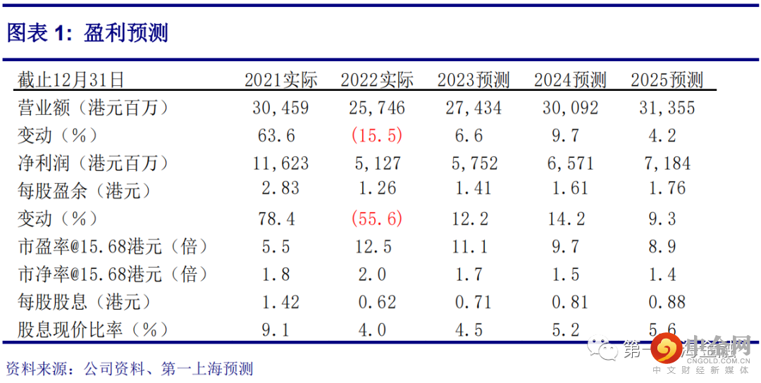 虽然短期内地产行业景气度依然偏低,但在政府年初不断推出的稳定房地产的政策推动下,二季度竣工端需求有望好转,公司业绩逐渐筑底。我们预计2023/2024/2025 年收入预测为 274 亿/301 亿/314 亿元港元;归母净利润预测为57.5 亿/65.7 亿/71.8 亿港元,给予未来 12 个月目标价 20.00 港元,对应 2023年 14 倍 PE,维持买入评级。