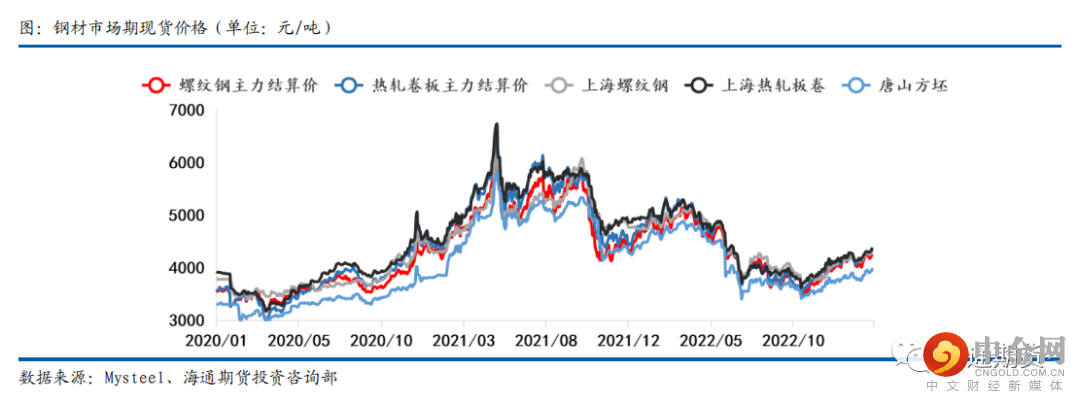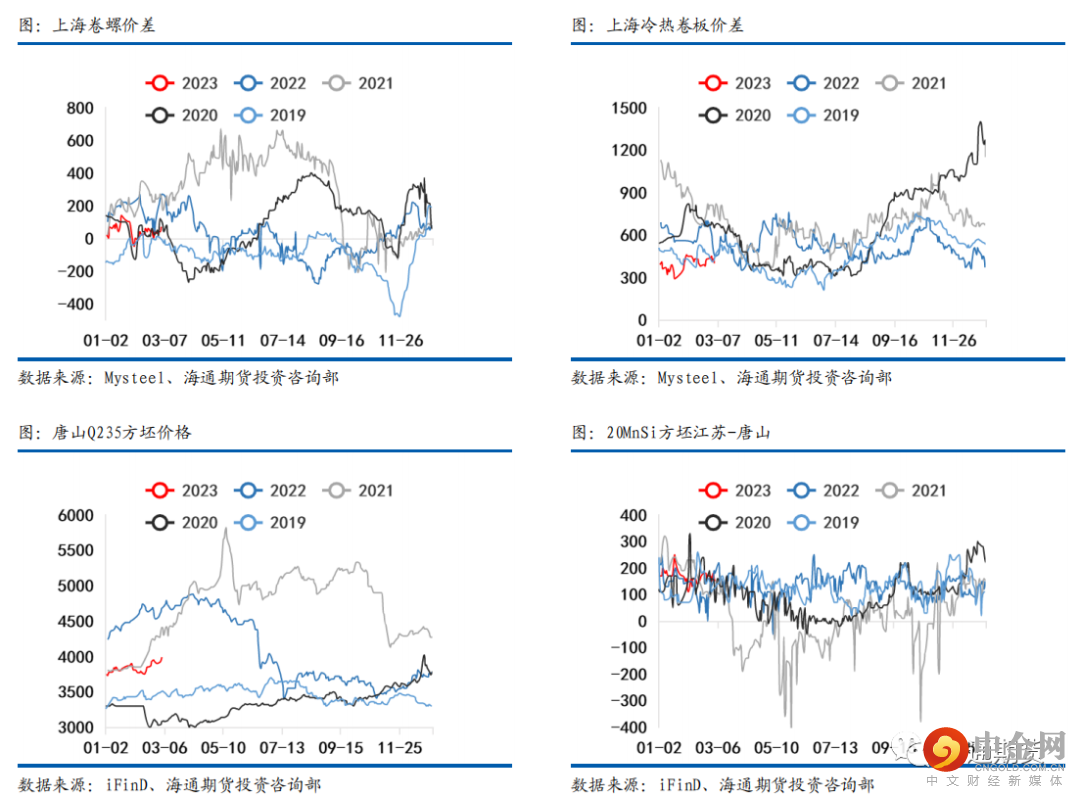 上周钢材期货盘面价格振荡偏强,现货价格振荡偏强运行。上周螺纹钢2305合约上涨1.28%至4272元/吨,热轧卷板2305合约上涨2.03%至4371元/吨。上周上海螺纹上涨50元/吨至4310元/吨,杭州螺纹上涨40元/吨至4350元/吨,广州螺纹下跌130元/吨至4430元/吨附近,北京螺纹上涨50元/吨至4220元/吨。螺纹华东华南过磅价差增至-120元/吨附近,华南北方过磅价差从280收窄至140元/吨附近。上海热卷上涨40元/吨至4340元/吨,广州热卷上涨70元/吨至4360元/吨,华东卷螺价差从热卷价格高出螺纹40元/吨缩小至30元/吨。上周各地区钢坯现货价格表现偏弱,唐山方坯Q235下跌10元/吨至3940元/吨,唐山20MnSi下跌10元/吨至4040元/吨,江苏20MnSi上涨30元/吨至4240元/吨,江苏和唐山间价差升至200元/吨。