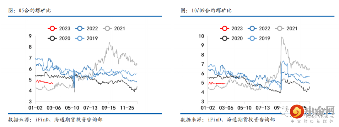 钢,05合约卷螺差从72回升至99元/吨;原料铁矿石表现与成材相当,05合约螺矿比从4.64先升后降至4.65。