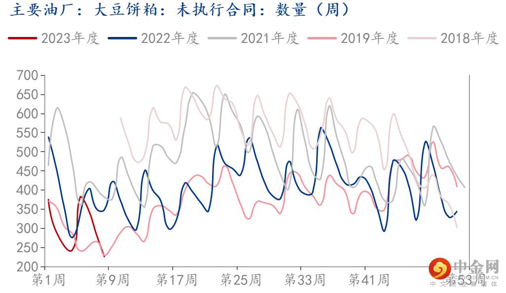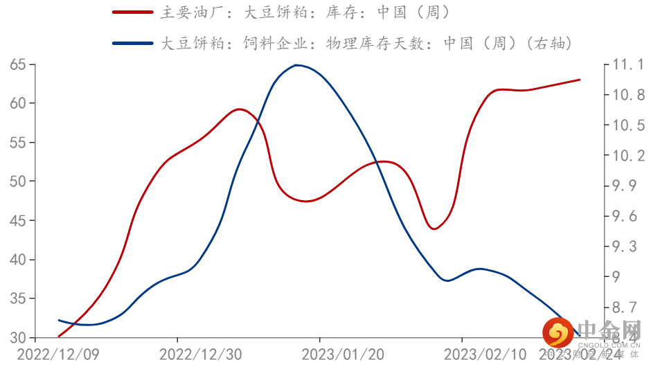 2月后两周,因下游需求表现疲软,部分工厂累库,油厂开机下调,又因中下游买货积极性不足,饲料销售进度差,豆粕现货成交惨淡。2月份整体提货量较上个月明显回升,因春节后下游企业库存消化后,建立合理的豆粕物理库存天数。2月下旬饲料企业库存天数有所下滑。下游饲料消费疲弱,节后补库的力度较弱,大部分饲料企业维持刚需为主。市场心态较为悲观,下游采购动作谨慎。