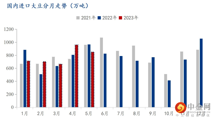 据 Mysteel农产品团队对2023年4月及5月的进口大豆数量初步统计,其中4 月进口大豆到港量预计 960 万吨,5 月进口大豆到港量预计850万吨。2023 年 3 月份国内主要地区 123 家油厂大豆到港预估102 船,共计约663万吨(本月船重按 6.5 万吨计)。