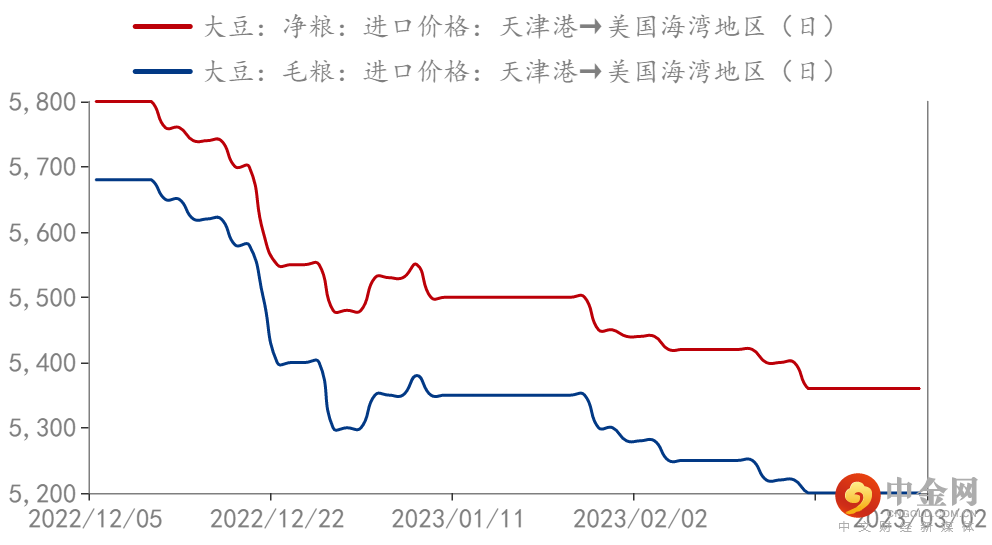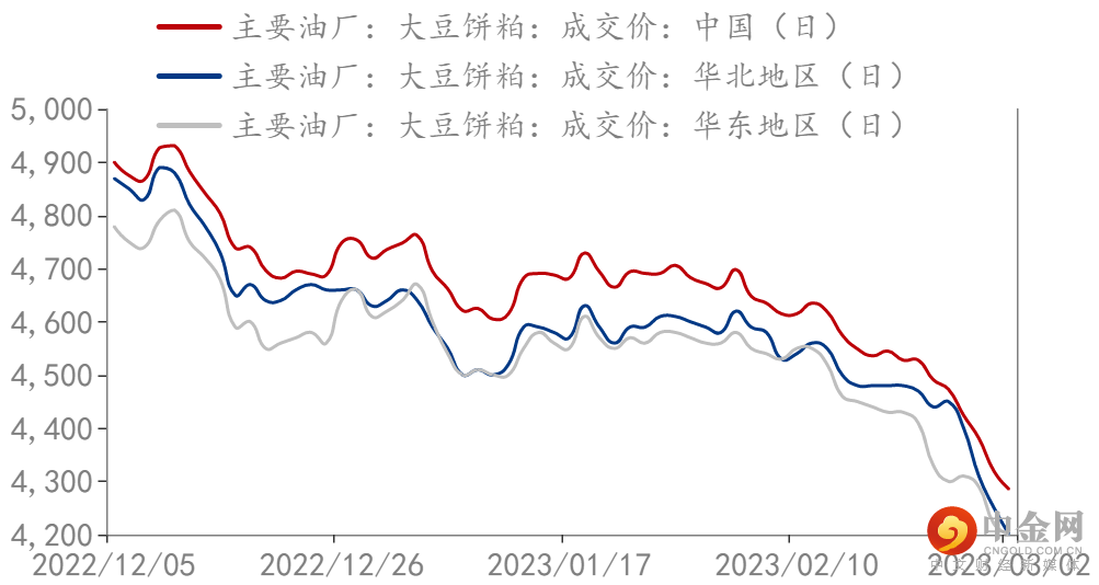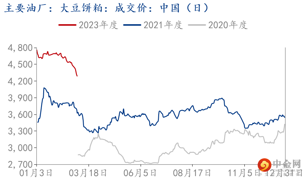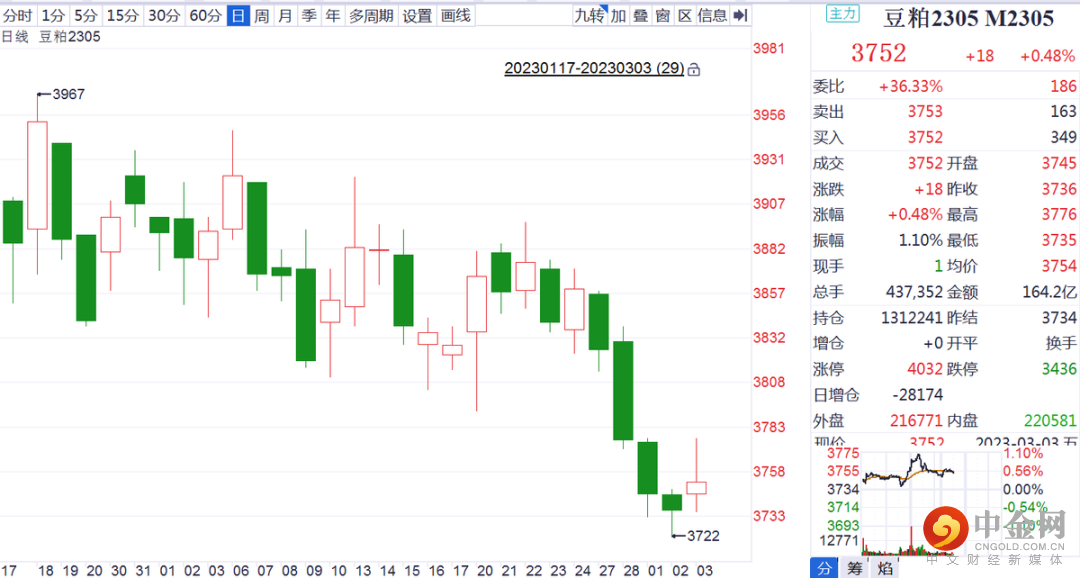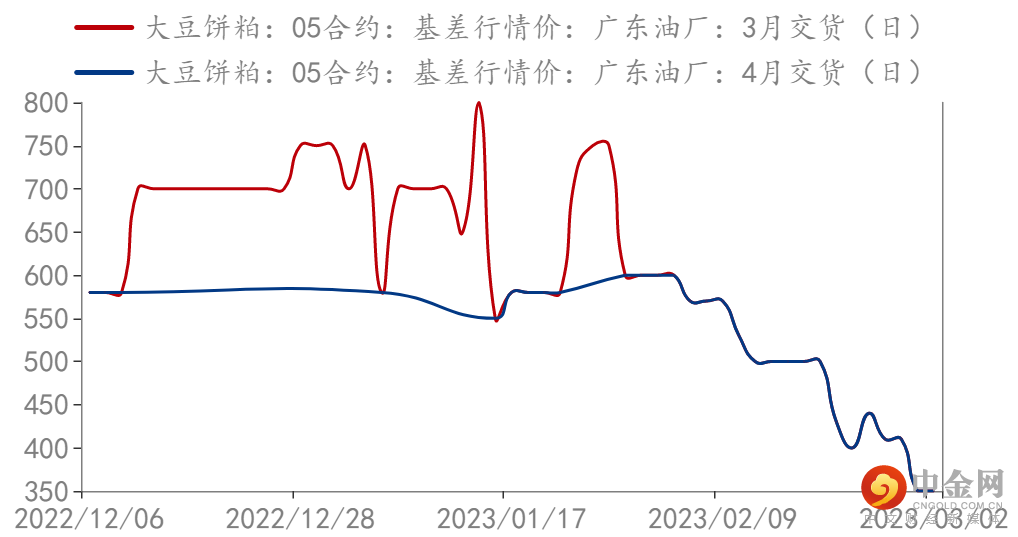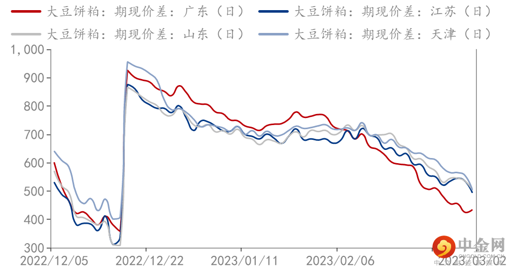 1月30日至3月3日,豆粕2305合约期价2月6日创近期高点3947元/吨,3月2日创近期低点3722元/吨。2月末豆粕2305合约期价,在2月20日前处于窄幅区间震荡,随后处于下跌通道中。豆粕现货价格不断走低,国内需求表现不佳,豆粕现货价格跌幅大于豆粕期货价格的跌幅,市场预期偏弱悲观豆粕现货价格也是不断下跌。