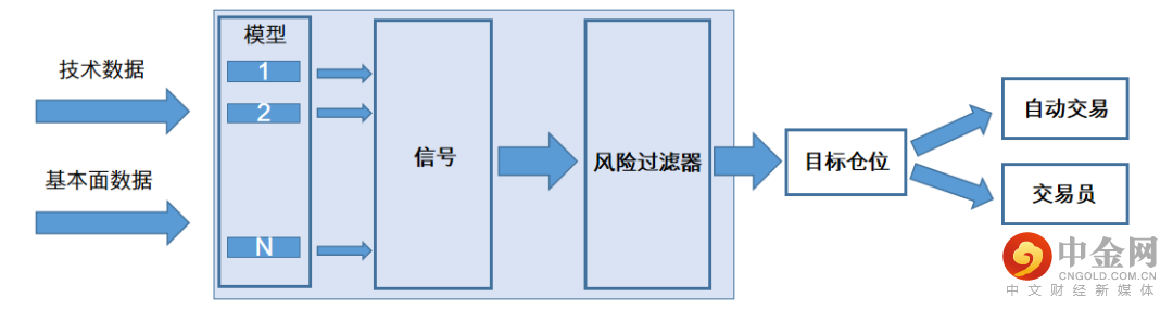 量化CTA策略通过分析海量的技术数据和基本面数据,利用数据研究建立多个量化策略模型,生成交易信号;并通过内置的风险管理过滤模型,生成目标仓位;最后进行交易执行。除了交易执行外,整个过程基本是100%系统量化,无人工干预。