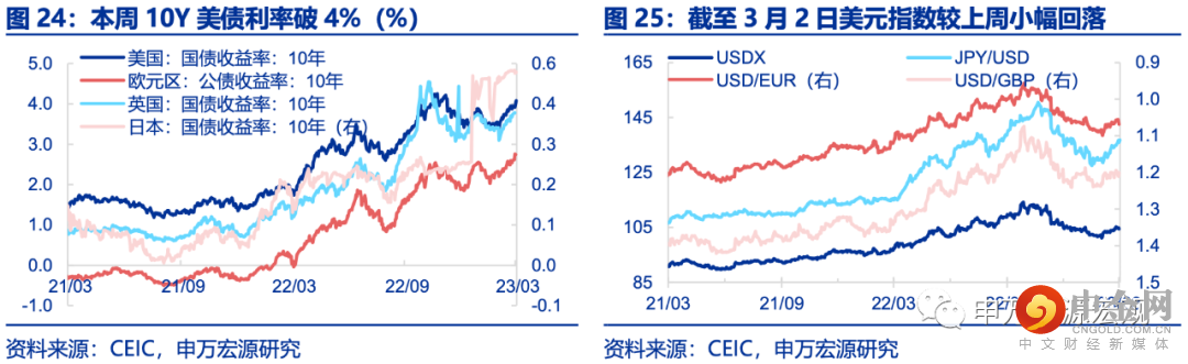 汇率利率黄金:截至3月2日,10Y美债利率上行至4.08%附近,自去年11月以来再度破4%。本周美元指数小幅下行,截至3月2日美元指数回落至104.5。