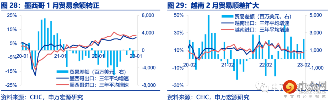 1月墨西哥贸易逆差转正,越南2月贸易顺差扩大。墨西哥1月进出口三年平均增速俱上行,其中出口额增幅远大于进口量,导致贸易逆差转正至0.3亿美元。越南2月录得23亿美元的贸易差额,这是自去年10月以来最大的贸易顺差,主要由于全球需求强劲,出口大幅增长所导致。