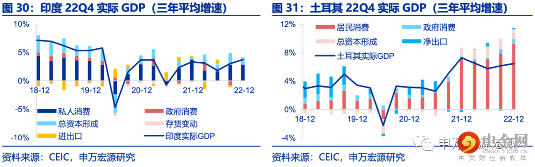 印度、土耳其四季度实际GDP三年平均增速均有所提升。印度22Q4实际GDP三年平均增速3.7%,同比4.4%,主要受私人消费所拉动。土耳其22Q4实际GDP三年平均增速6.5%,同比3.5%,居民消费、政府消费和净出口为主要推动力。