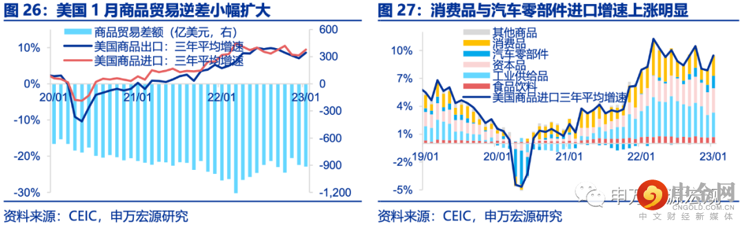 全球贸易:美国1月商品贸易进口三年平均增速9.5%,出口三年平均增速8.6%,商品贸易逆差扩大至915亿美元。