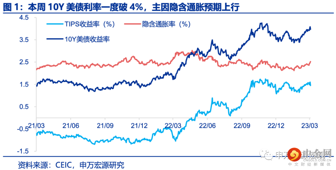随着今年2月陆续公布的美国经济数据超预期,指向美国居民消费强韧,通胀下行可能慢于前期预期,10Y美债利率自1月末以来上行达45BP至4.08%(截止3月3日),突破4%,其中主要为隐含通胀预期贡献(28BP),而实际利率亦贡献17BP,凸显市场对美国通胀未来走势向上修正,同时市场对美联储加息预期也大幅上调。而本周10Y美债利率的上行结构中(2BP),主要贡献仍来自于隐含通胀预期(14BP),实际利率却小幅回落12BP,显示市场对于美国通胀担忧持续提升,但市场对于美联储未来紧缩预期有所反复。