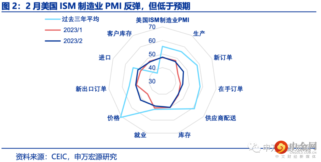 2月美国ISM制造业PMI环比反弹0.3至47.7,但幅度低于市场预期。从结构上来看,新订单指数从42.5回升至47.0,未完成订单指数从43.4上行至45.1,或反映超额储蓄作用下美国居民需求仍然旺盛。同时产出指数、就业指数却分别下滑0.7和1.5,或反映制造业生产是有所弱化的,则美国需求缺口收窄可能出现反复。特别是价格指数大幅反弹6.8至51.3,增添市场对于后续美国通胀降温出现波动的担忧。