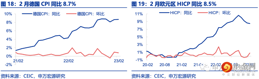 CPI通胀:德国2月CPI环比0.8%,同比8.7%,与上月持平。欧元区2月HICP环比0.8%,同比8.5%,降温程度低于预期,通胀仍处高位。