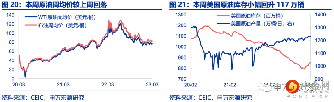 油价和PPI:截至3月2日,布油周均价回升至83.2美元/桶。本周美国原油库存小幅回升117万桶,原油产量维持1230万桶。