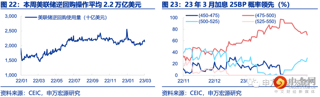 货币操作:本周美联储逆回购操作平均2.2万亿美元。目前市场依然预期美联储23年3月加息25bp(70.1%),但较上周概率小幅下滑。