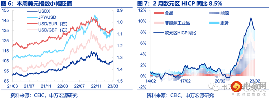 本周美元指数小幅贬值,反映欧央行“鹰声嘹亮”。从近一个月的表现来看,的确美元指数和10Y美债利率同向上升,美元指数较1月末升值2.9%,但近一周以来,美元指数却是小幅贬值的(-0.7%),其中欧元相对美元升值0.4%,或反映欧央行紧缩预期阶段性更为激进。本周公布的欧元区2月HICP同比8.5%,仅较上月回落0.1个百分点,慢于市场预期,其中受益于天然气价格回落,能源同比贡献回落0.6个百分点,但核心服务通胀贡献上行0.2个百分点,或反映欧元区通胀下行亦不会一帆风顺,欧央行紧缩预期上升,从而导致欧元本周相对美元升值。