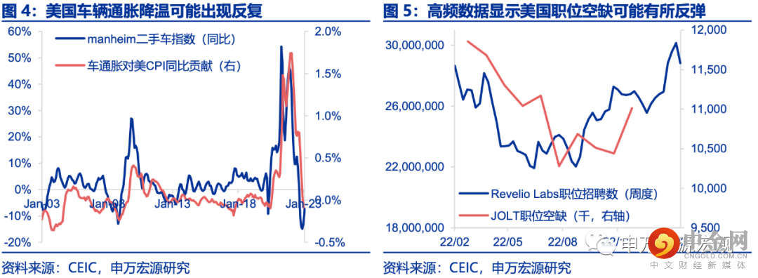 ,虽然年内美国房租通胀将出现拐点,但我们认为有两大因素可能使得美国通胀降温慢于市场预期。其一,疫情之后领先美国车辆通胀约2个月的Manheim二手车指数已连续3月环比反弹,美国耐用品通胀可能出现上行压力。其二,在超额储蓄犹存,美国居民消费火热传导下,美国劳动力市场降温速度可能较慢,可能导致核心非居住/房租通胀回落慢于预期。