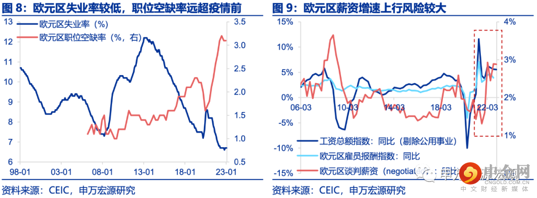 本周公布的欧央行2月会议纪要表现出对通胀持续性的担忧,提到“担心过度加息的危险为时过早”、“利率或还未进入限制性区间”,凸显遵循单一通胀目标制下的欧央行并未表现出美联储对于货币政策过度收紧的担忧,当前市场预期3月加息50BP概率较高。同时,针对核心通胀的粘性,欧央行担忧可能会受到劳动市场偏紧——薪资增速走高的影响。欧元区失业率位居历史低位,而职位空缺率远超疫情之前,同时薪资增速也是较高的。在美国的前车之鉴下,预计后续欧央行紧缩力度可能较大,欧洲经济在堪堪躲过冬季天然气危机之后,或又将面临货币紧缩的重压,而这样的重压对于需求和生产均相对美国较弱的欧元区经济可能影响更大。