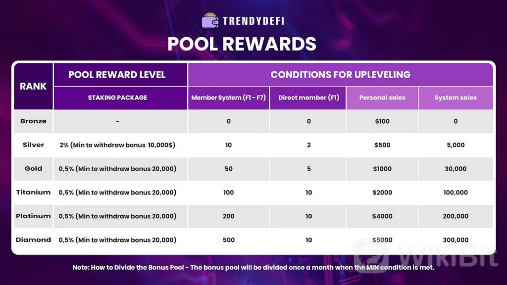 此外,Trendy DeFi 为满足最低要求的人提供矿池排名奖励。 由于活跃成员质押了一定数量的代币,他们可以获得额外奖励并在池中排名上升,如下表所示: