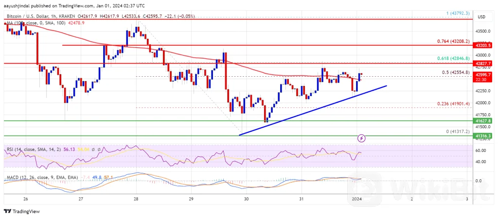 比特币目前交易价格高于 42,200 美元和 100 小时简单移动平均线。 BTC/USD 货币对的小时图上还形成了一条关键的看涨趋势线,支撑位在 42,280 美元附近。