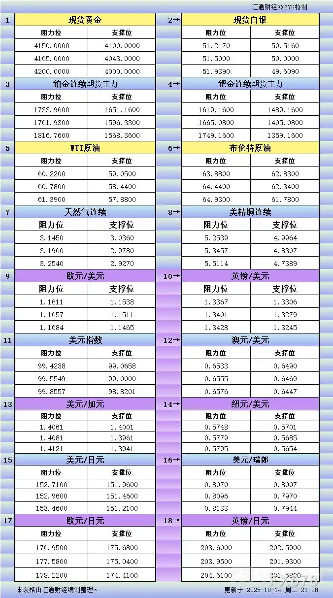 10月14日美市更新的黄金、白银、铂金、钯金、原油、天然气、铜(商品)以及:、欧元、英镑、日元、瑞郎、澳元、加元、纽元(热门货币对)的支撑阻力位一览。