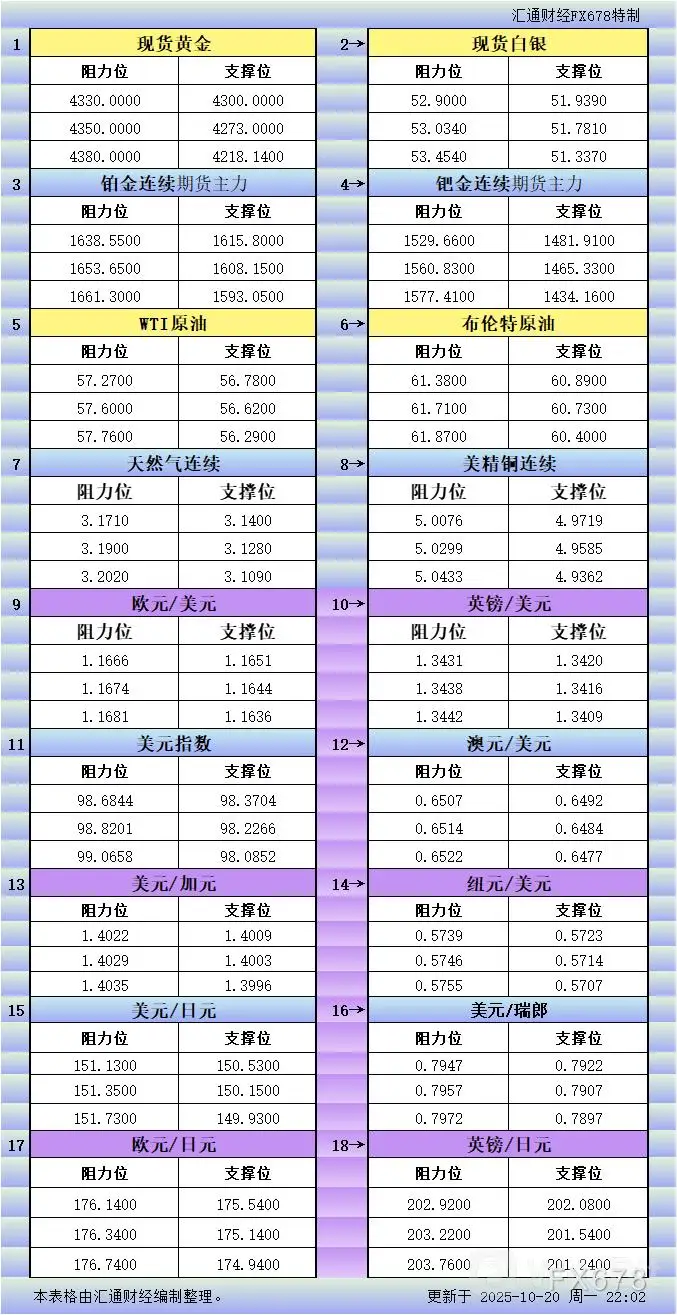 摘要: 10月20日美市更新支撑阻力:18品种支撑阻力(金银铂钯原油天然气铜及十大货币对)
