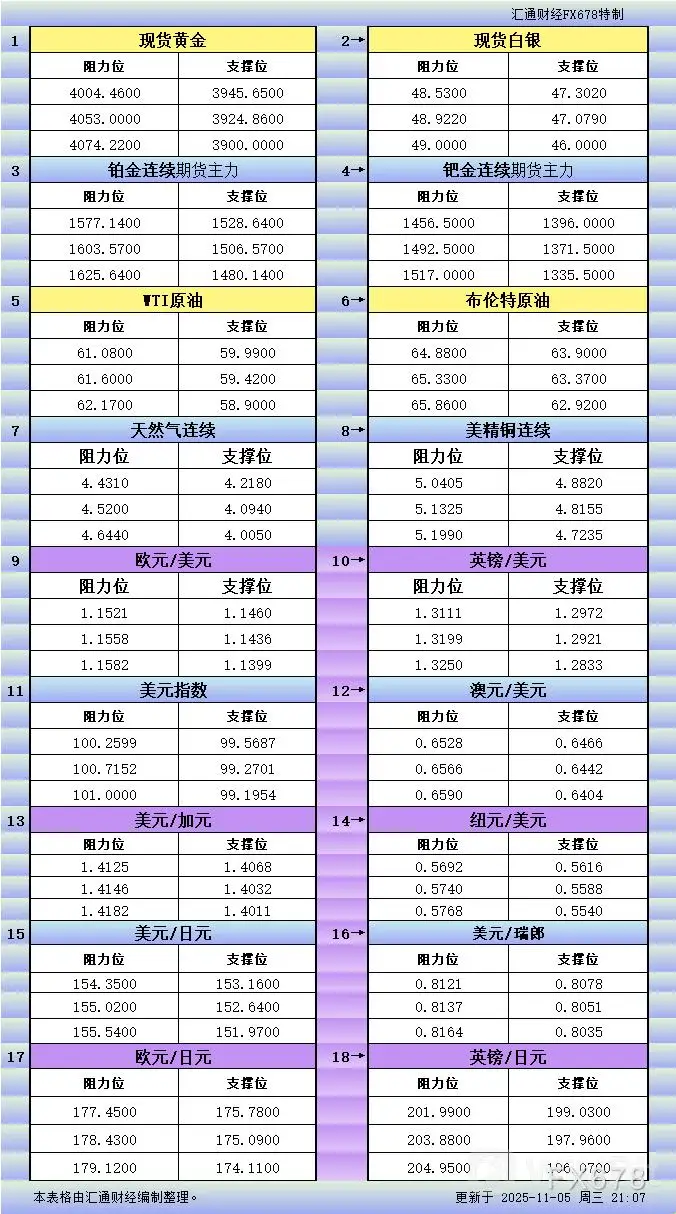 11月5日美市更新支撑阻力:18品种支撑阻力(金银铂钯原油天然气铜及十大货币对)