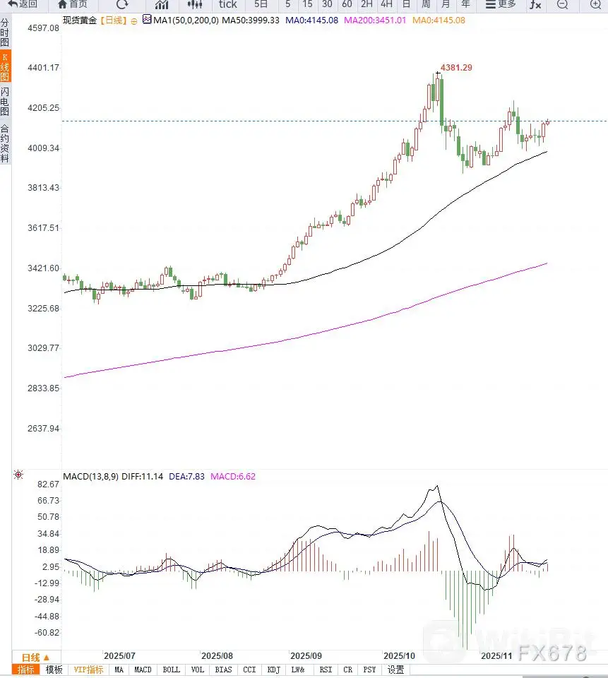 若失守 4100美元则更深的多重支撑位在4030美元附近,破位将把短期偏向转为空头,可能把价格拖向4000美元附近。