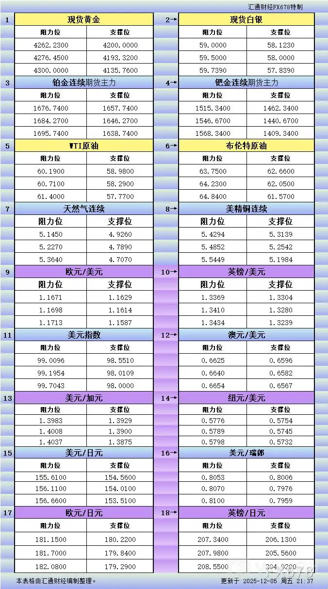 12月5日美市更新支撑阻力:18品种支撑阻力(金银铂钯原油天然气铜及十大货币对)