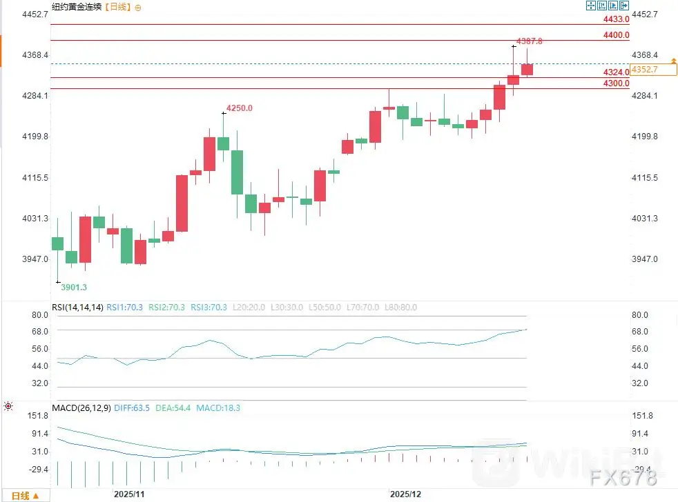 从技术层面来看,2月黄金期货多头的下一个上行价格目标是收盘价突破4433.00美元的合约/历史高点这一强劲阻力位。空头的近期下行价格目标是将期货价格推至4200.00美元的强劲技术支撑位下方。第一阻力位见于上周高点4387.00美元,随后是4400.00美元;第一支撑位见于隔夜低点4324.40美元,随后是4300.00美元。