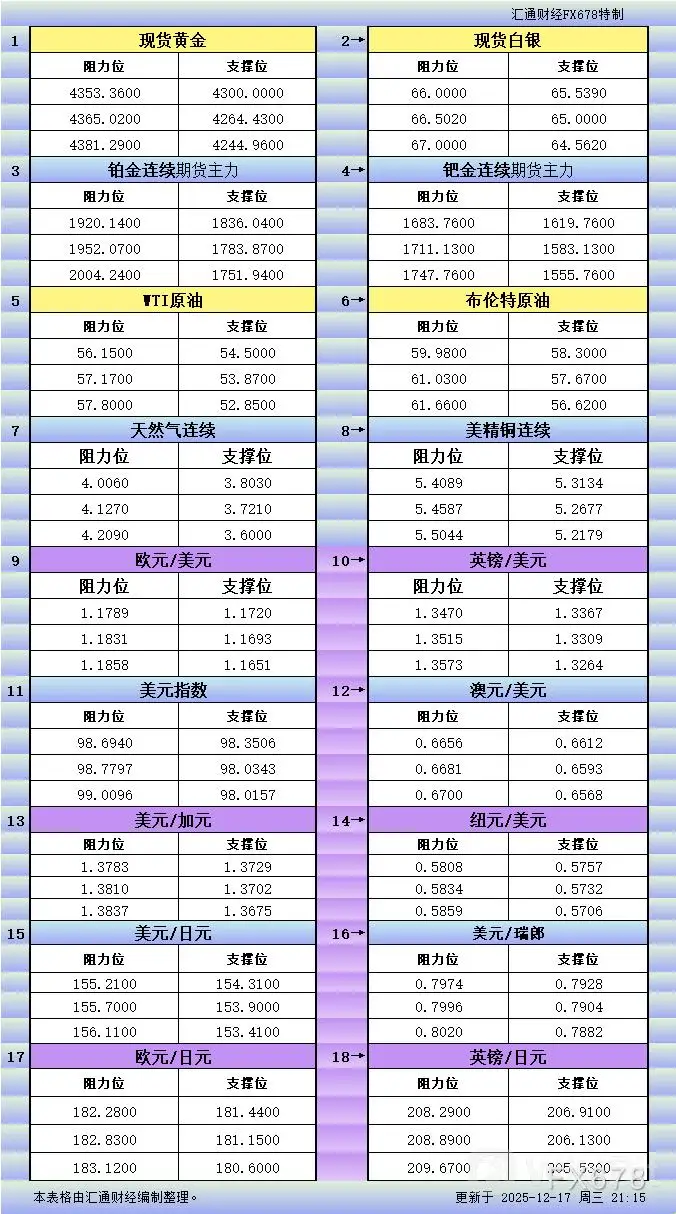 12月17日美市更新支撑阻力:18品种支撑阻力(金银铂钯原油天然气铜及十大货币对)