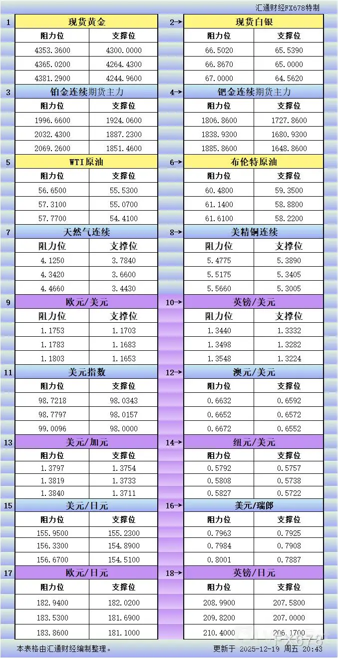 12月19日美市更新支撑阻力:18品种支撑阻力(金银铂钯原油天然气铜及十大货币对)
