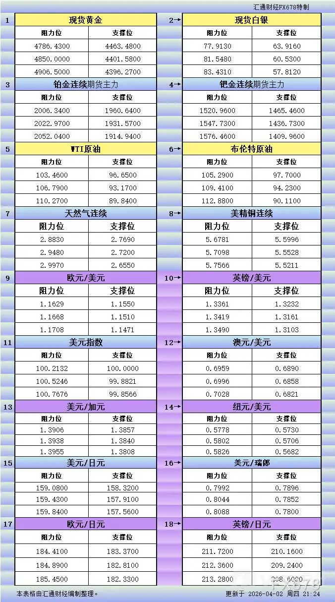 4月2日美市更新支撑阻力:18品种支撑阻力(金银铂钯原油天然气铜及十大货币对)