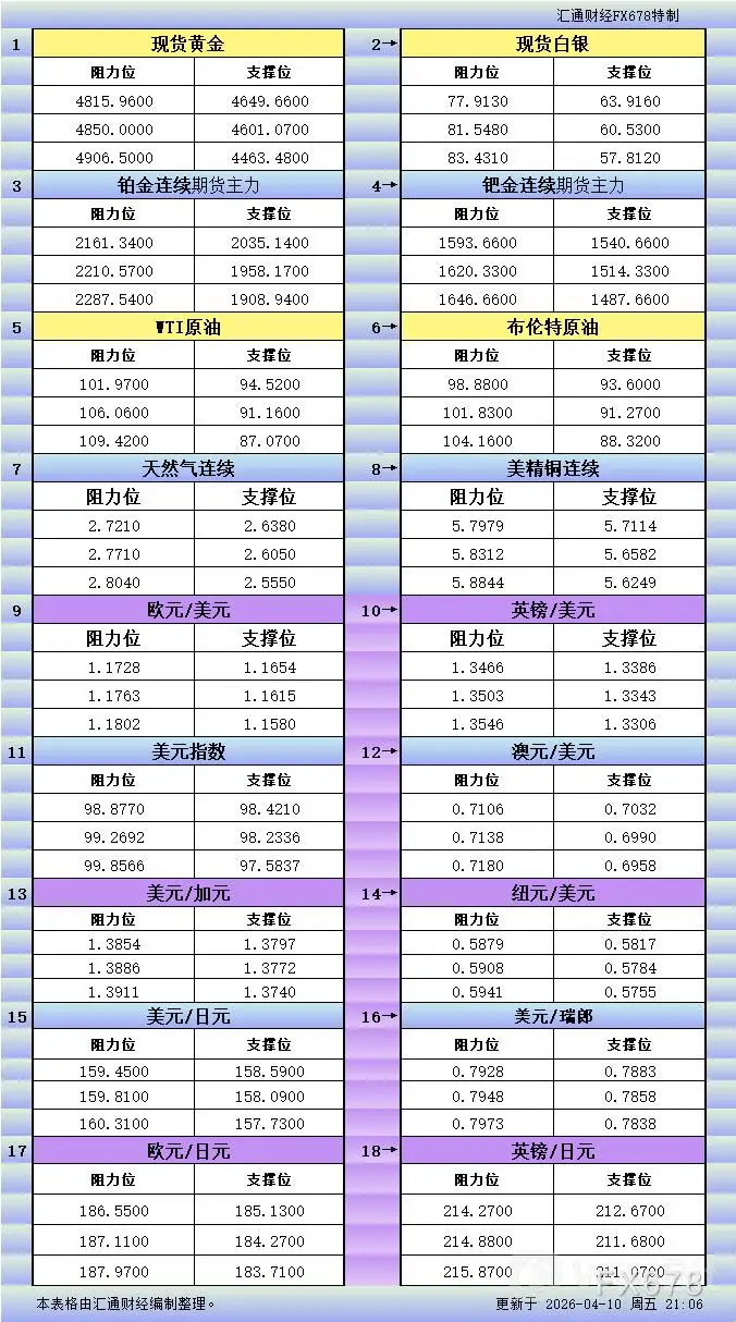 4月10日美市更新支撑阻力:18品种支撑阻力(金银铂钯原油天然气铜及十大货币对)