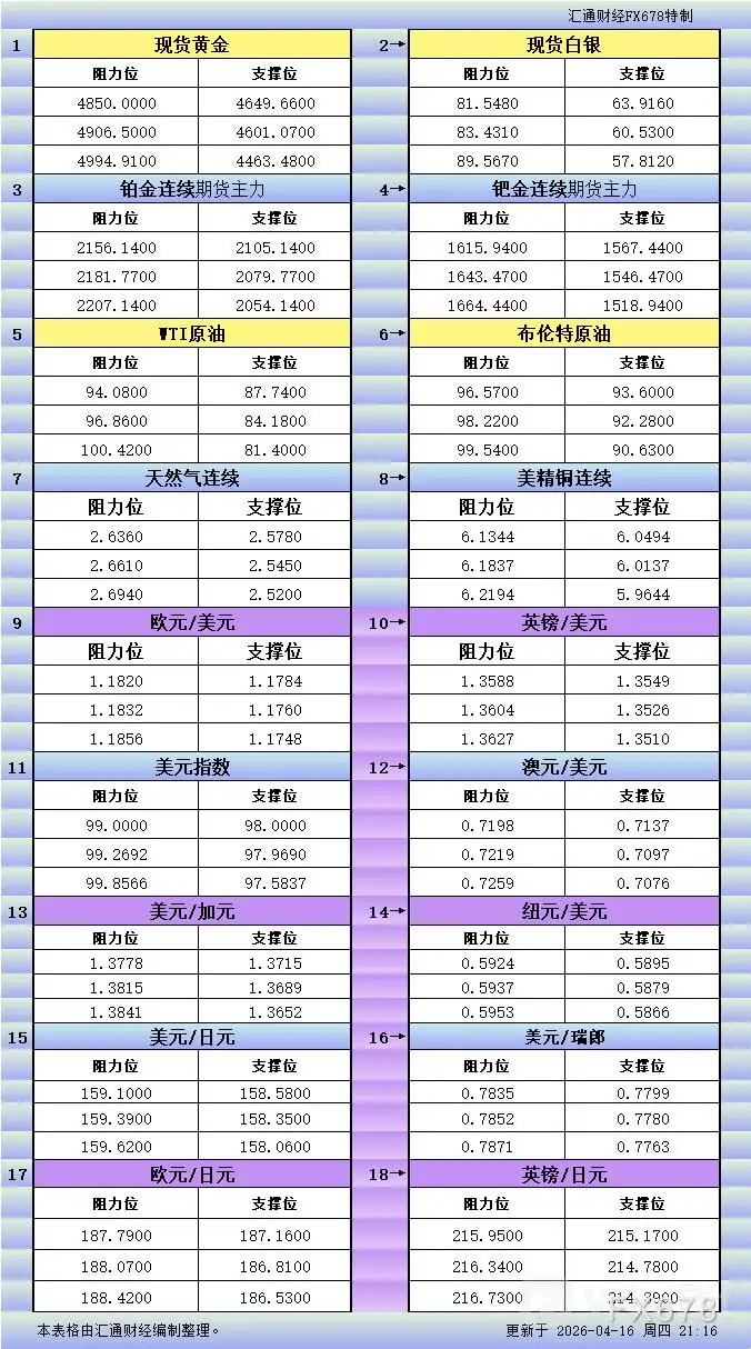 4月16日美市更新支撑阻力:18品种支撑阻力(金银铂钯原油天然气铜及十大货币对)