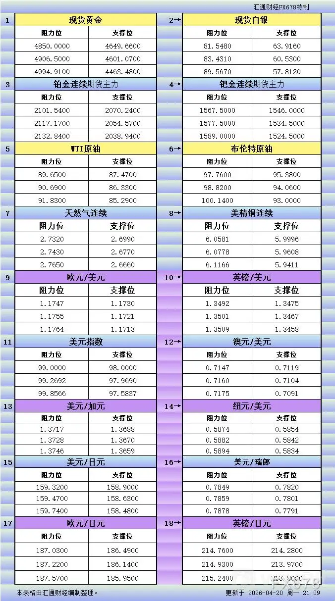4月20日美市更新支撑阻力:18品种支撑阻力(金银铂钯原油天然气铜及十大货币对)