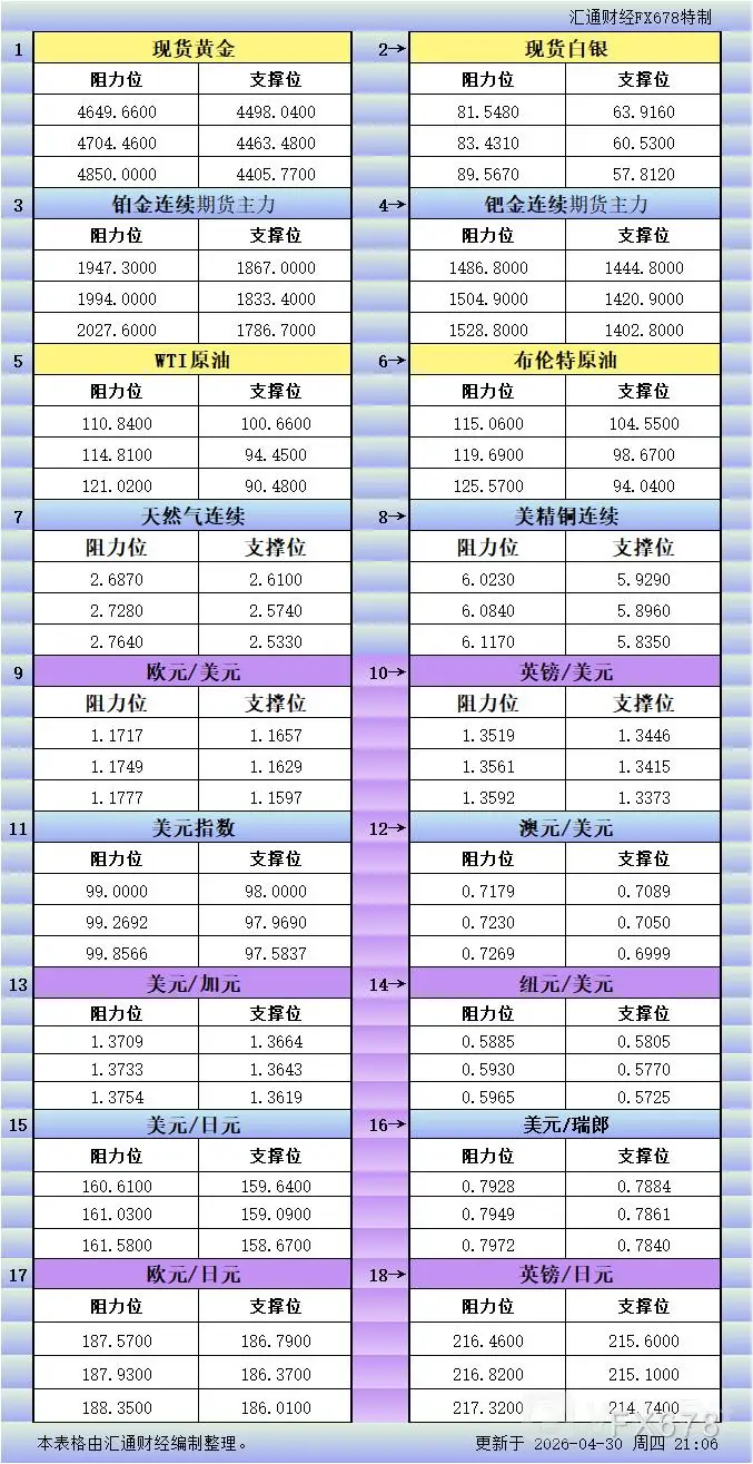 4月30日美市更新支撑阻力:18品种支撑阻力(金银铂钯原油天然气铜及十大货币对)